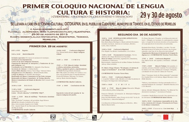 Kimach ihtoti tosentlaliskeh, tiknekih tipewaskeh titlahtlachiaskeh, timixmatiskeh okseki siyi tehwan ma amo techilikan tikenimehkeh, ma tehwan tikmatikan. Primer coloquio en nuestra comunidad, la intención es despertar más interés en nuestra misma gente, recuperar nuestra dignidad más allá de seguir siendo objeto de estudio (Victorino Torres Nava).
