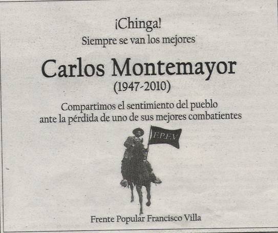 Se nos ha adelantado don Carlos Montemayor, una mente crítica, constructiva y libre. De los últimos intelectuales que tuvieron en su pluma, una fase creadora en diversos ámbitos de las ciencias humanas. Lo recordaremos por sus obras literarias y su afán de promover el respeto y conocimiento de las lenguas indígenas. Descanse en paz don Carlos Montemayor, nuestra patria se convulsiona entre la sangre derramada de sus hijos, producto de la miseria, la corrupción y la ineptitud de sus gobernantes y de la ambición desmedida de las élites política y económica, que han fortalecido el narcotráfico, un cáncer que destruye todo lo que toca. Hasta luego maestro.