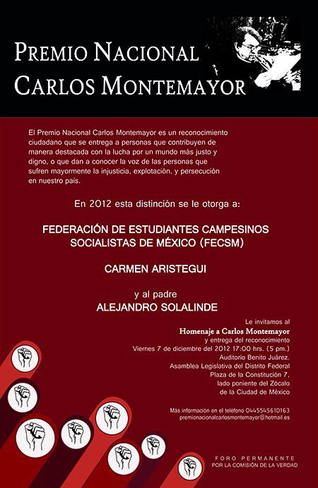 El Premio Nacional Carlos Montemayor se instauró en el 2010, posterior a la muerte del poeta y escritory es un reconocimiento ciudadano que se entrega a personas que contribuyen de manera destacada con la lucha por un mundo más justo y digno, o por dar a conocer la voz de las personas que sufren mayormente la injusticia, explotación, marginación y persecución en nuestro país. El año anterior se entrego a Concepción Calvillo viuda de Nava, Luis Sosa y a la Revista Contralínea.